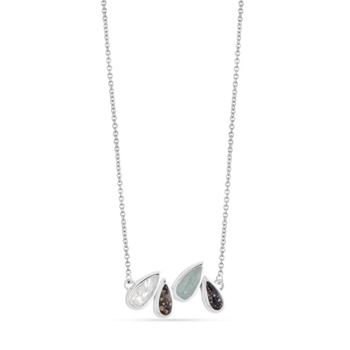 Four teardrop settings sit gracefully upon your collarbone, forming a constellation of coordinates—fluid and elegant, connecting life’s most meaningful points in unexpected ways. From the canals of Amsterdam to the glacial bays of Alaska, each holds sand from distant shores, earth from a beloved home, or stones that honor the people and moments that shaped you—reminding you that every change in latitude carries a piece of your story, whether it leads across oceans, into far-off cities, or back to where it all began.
