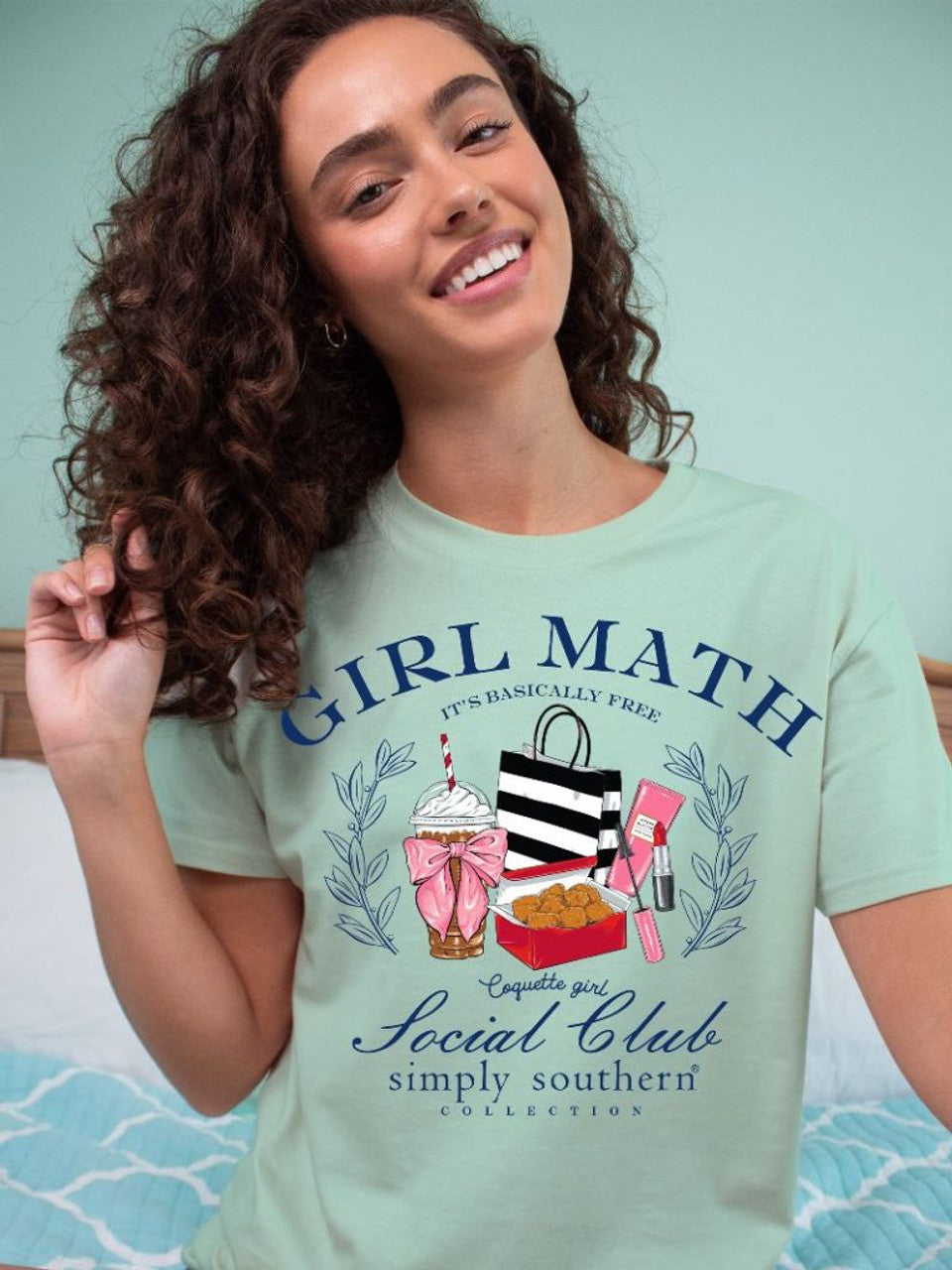 Blue green short sleeve shirt with the phrases 'Girl Math', 'It's basically free', Coquette Girl', and 'Social Club'. There is a shopping bag with makeup, an iced drink, and an order of nuggets. Simply Southern logo below and on upper back. 100% cotton. Unisex sizing.