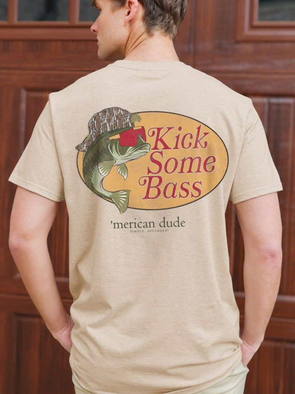 Light heather brown short sleeve shirt with the phrase 'Kick some bass' and bass fish wearing a hat and shades. Simply Southern logo below. Similar design on left chest. 98% cotton / 2% polyester blend.