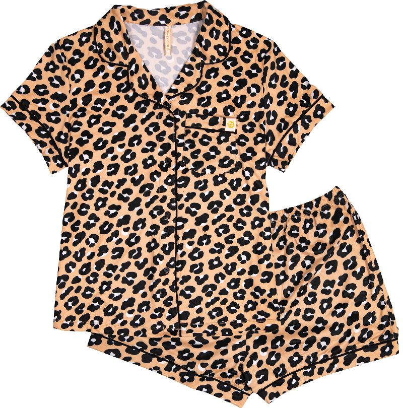 Black and tan leopard print pj set with short sleeve button down top and matching short bottoms