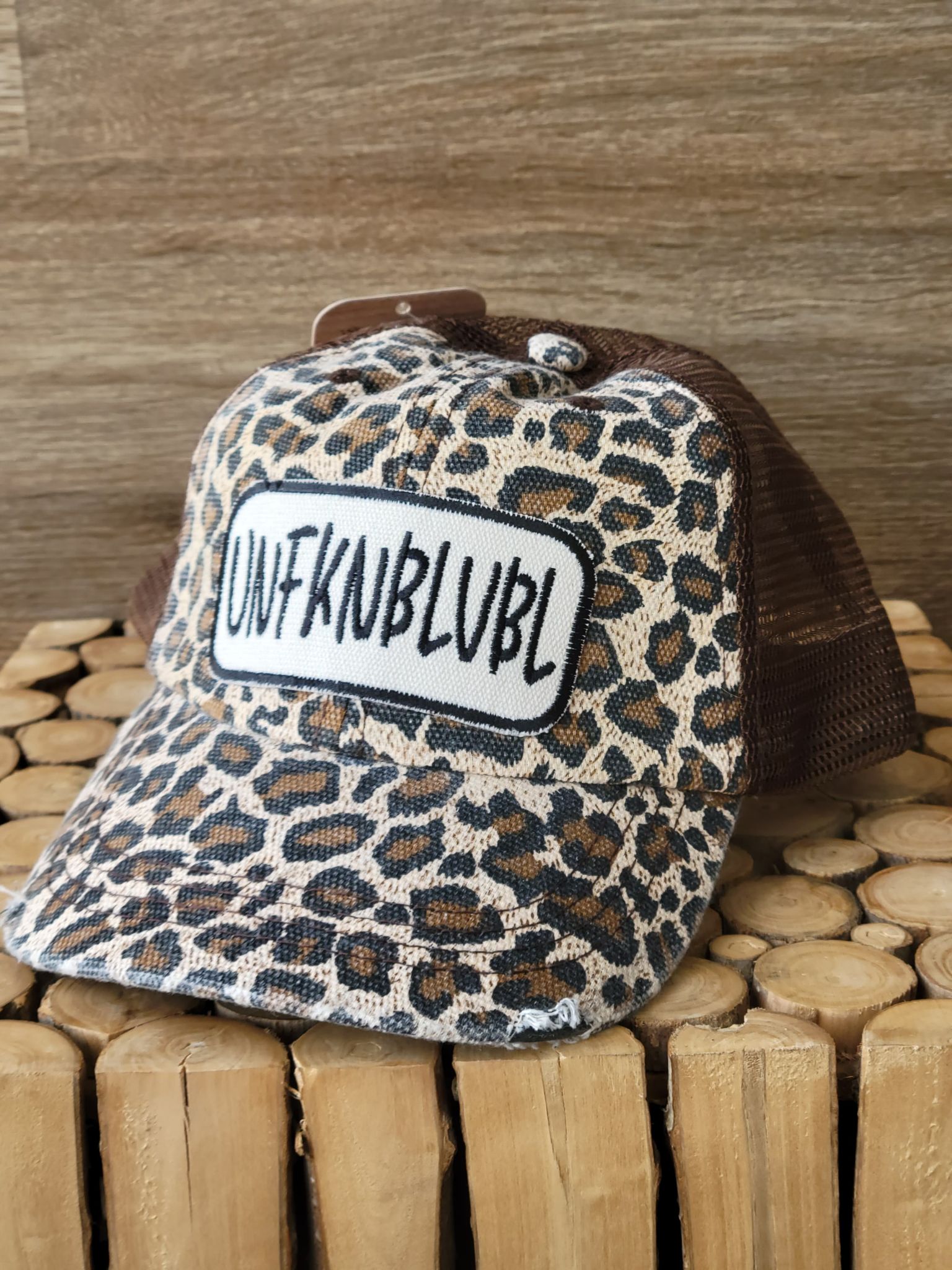 Leopard Ponytail hat with an embroidered UNFKNBLVBL patch sewed on the front.